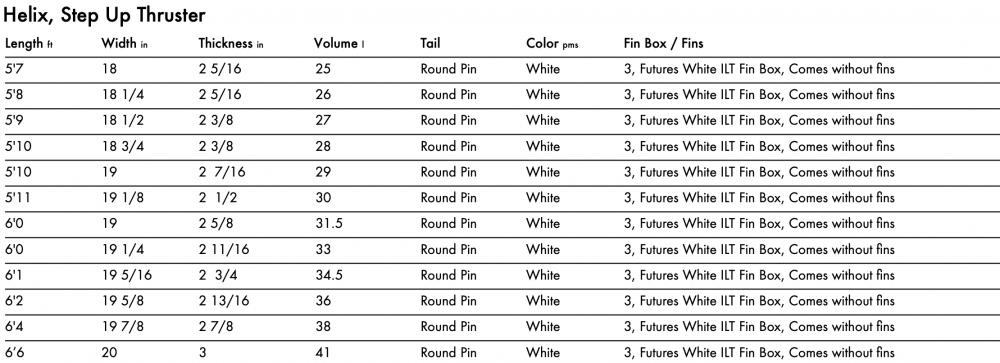 L'Helix a un tail un peu plus large et le point large n'est pas aussi loin vers l'avant. Elle a un tail rocker moyen avec une entrée moyenne. Cela permet à la planche de gérer des vagues plus lourdes et de tourner à des vitesses plus rapides. Un rail moyen pour un peu d'accroche et pourtant assez tolérant pour les vitesses plus rapides.