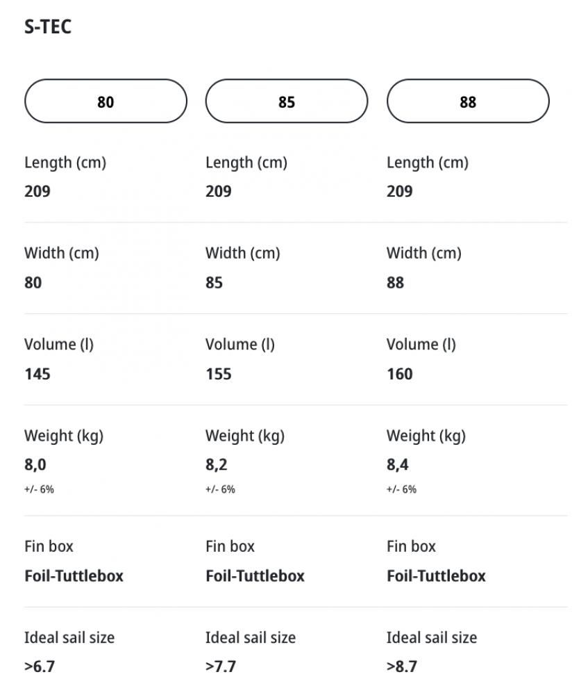 La gamme a été rationalisée aux tailles de base : 80, 85 et 88. L'accent principal a été mis sur l'efficacité, en particulier sur la minimisation de la résistance et l'amélioration du contrôle dans les airs. Pour y parvenir, les planches sont dotées d'un nez plat, de rails fins à l'avant et d'un pont légèrement bombé au niveau du nez pour optimiser le flux d'air. La forme du pont dans la zone debout est plate, avec des pads surélevés qui s'étendent au-dessus du rail, offrant un effet de levier constant vers le foil. Seule la taille de compétition principale, le 85, est désormais disponible dans une forme entièrement nouvelle.