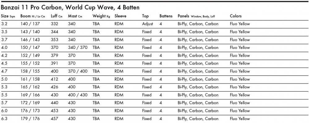Caractéristique de maniabilité : Le lift est légèrement plus haut et plus en arrière que sur la Banzai Surf Pro et la Banzai Max Pro, ce qui favorise une sensation plus droite mais donne aussi une touche de pression sur l'arrière de la main pour plus d'accélérateur quand vous en avez besoin. Une sensation directe mais flexible vous permet de rester connecté à tout moment pendant les manœuvres. La Banzai 11 Pro est notre voile de vagues performante pour la Coupe du Monde, conçue pour gagner dans toutes les conditions de vagues et de manœuvres.