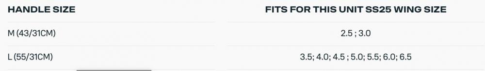 La poignée avant est disponible en deux tailles : Taille M (43 cm) pour les ailes de 2.5 à 3.0, et Taille L (55 cm) pour les ailes de 3.5 à 6.5. La poignée arrière (31 cm) convient à toutes les tailles d'ailes.