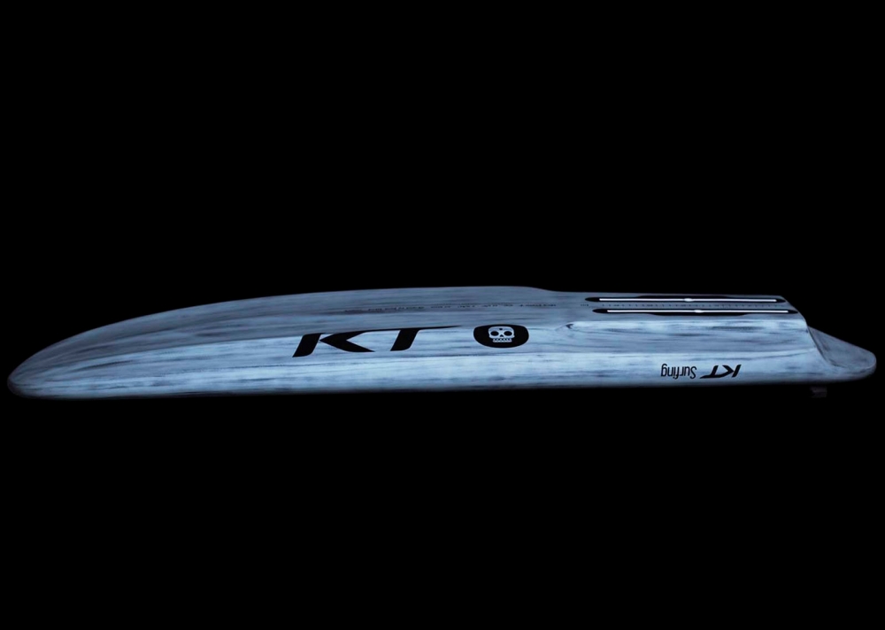 Fond quadruple concave signé KT Surfing avec des rails biseautés pour un atterrissage plus doux et un relâchement plus rapide lors du foiling.