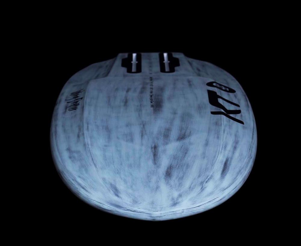 Si KT Surfing fait sensation, en ce moment, avec sa Ginxu et son shape si particulier, nous avions hâte de découvrir cette autre planche shapée par Keith Teboul, moins radicale sur le papier. Dans cette couleur bleue/grise patinée, elle est plutôt aseptisée jusqu’à tomber sur cette tête de squelette façon "Dia de los Muertos", c’est original ! Son shape est très travaillé, avec le fameux quadri-concave, sur l’avant, des rails coupés en deux épaisseurs distinctes pour diminuer la surface mouillée entre la position arrêtée avec le besoin de toute la largeur et ensuite la prise de vitesse et la surface minimale en contact avec l’eau avant de prendre le vol. L’arrière "squash" est lui aussi travaillé avec un arrière coupé, toujours dans l’objectif de diminuer la trainée au moment de prendre de la vitesse. Comme de nombreuses marques, KT a instauré le moins de déchets plastiques dans son mode de livraison et nous avons reçu la planche dans son carton avec juste l’emballage scotch et du carton partout.