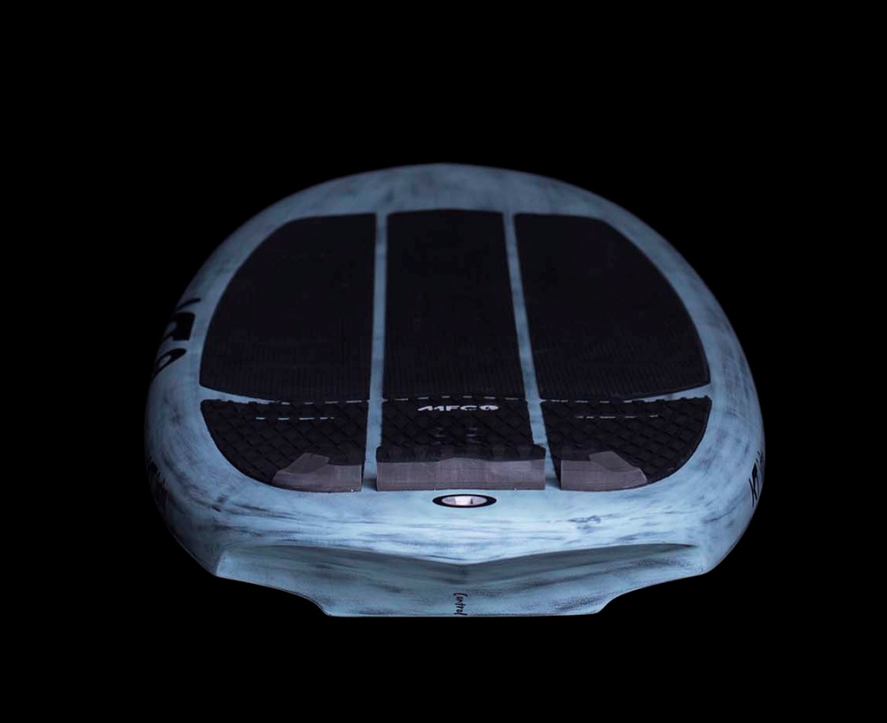 La marque explique que, dans ce volume, il n’y a pas besoin de valve de décompression pour les variations de pression en avion ou en altitude, mais insiste sur l’attention particulière à avoir si vous la laissez dans la voiture en plein soleil (et une exclusion de garantie). Partenaire d’autres marques, ce flotteur est livré avec de beaux footstraps et un pad multi textures de la marque MFC. Ce pad est original puisqu’il est collé en six pièces différentes. Sur l’arrière, il offre un très bon maintien du pied avec de petits reliefs et un kicktail, alors que la partie avant est moins marquée et offre juste de petits points pour l’antidérapant. Quatre positions de straps sont proposées sur la longueur ainsi que deux angles différents sur le pied avant. Sur l’arrière, c’est chose rare, mais il y a trois rangées d’inserts pour faire varier votre position de pied comme vous l’entendez. A noter que les straps doivent être positionnés avec un système anti-rotation, fourni. L'anneau d'accroche du leash est classique, bien centré, intégré dans un plug. La poignée de portage, quant à elle, se trouve sous le flotteur et devant les rails de platine mais elle offre une vraie prise en main pour rejoindre le plan d’eau. Les rails mesurent 25 cm et offrent des indications de réglages pour pouvoir réitérer ces derniers, sans lutter.