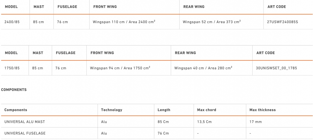 Le kit Universal ALU foil est l'outil idéal pour découvrir les sensations fortes du foil. Vous pouvez passer du wing au surf, au SUP ou au kite foil sans avoir à changer d'hydrofoil ! Cet hydrofoil vous permettra d'accélérer votre apprentissage comme vous ne l'auriez jamais imaginé. Le nouveau kit Universal SW alu est disponible en deux versions avec un mât en aluminium de 75 cm ou 85 cm. Le mât de 75 cm est recommandé pour mieux garder le contrôle lors de vos premiers vols, tandis que le mât de 85 cm est préférable une fois que vous avez progressé et que vous êtes capable de parcourir de plus longues distances. La nouvelle aile avant Universal en carbone 2400 est votre ticket pour apprendre à voler en un rien de temps et avec le vent le plus léger. Ses dimensions généreuses et son profil extra-épais vous permettront de décoller facilement et d'apprendre vos premiers jibes et virements de bord. L'aile arrière mesure 52 cm de large et présente un dièdre négatif pour améliorer la capacité de « pompage » et de carving du foil.