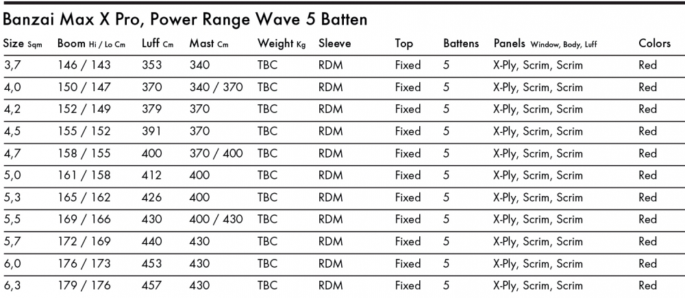 La toute nouvelle Banzai Max Pro est notre voile de vagues à 5 lattes. Elle offre un contrôle et une portée accrus dans des conditions très variées. Les 5 lattes augmentent la stabilité générale et les vitesses maximales.