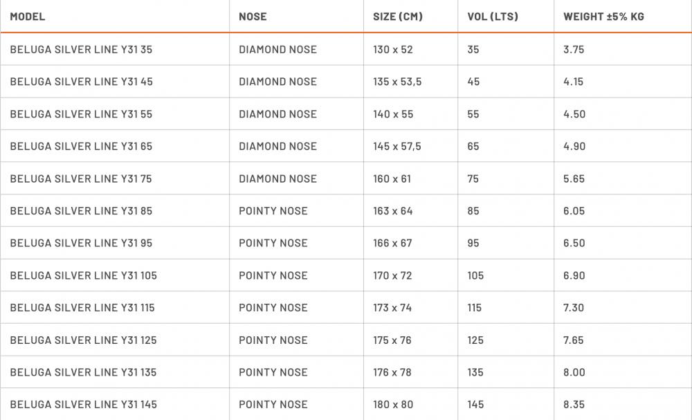 Pour les volumes plus petits conçus pour des performances pures en freestyle et en vagues, la Beluga Y31 présente un shape compact avec un nez en diamant et un tail carré concave. Le volume généreux positionné sur le nez offre une excellente flottabilité, rendant la planche idéale pour les figures de freestyle agressives telles que le pop et le repop.