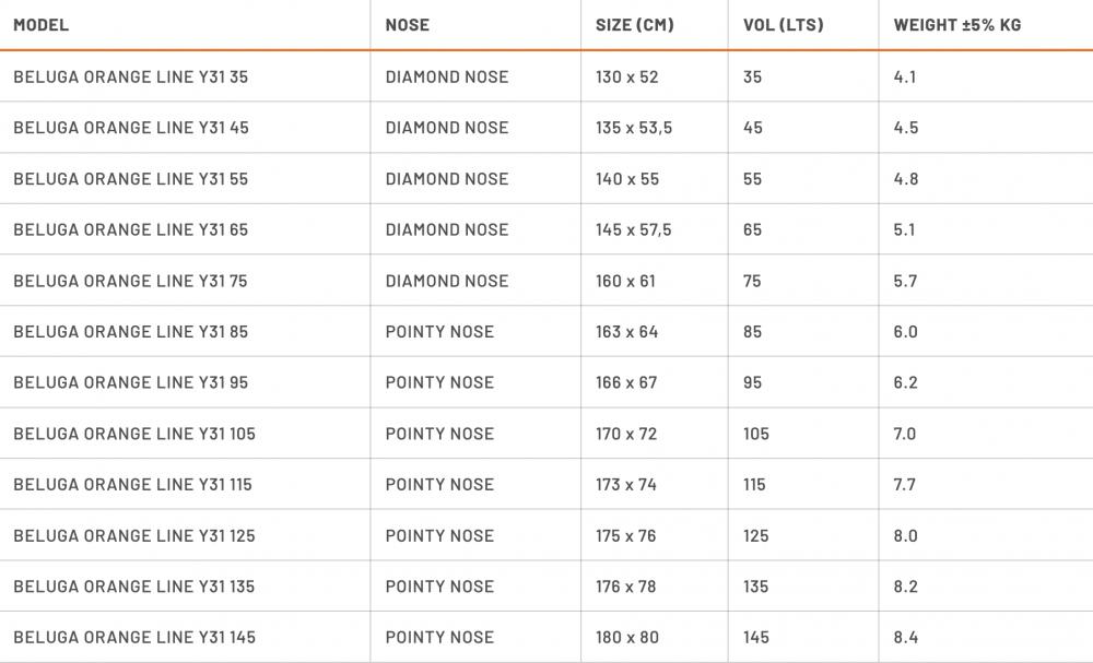 Pour les volumes plus petits conçus pour des performances pures en freestyle et en vagues, la Beluga Y31 présente un shape compact avec un nez en diamant et un tail carré concave. Le volume généreux positionné sur le nez offre une excellente flottabilité, rendant la planche idéale pour les figures de freestyle agressives telles que le pop et le repop.
