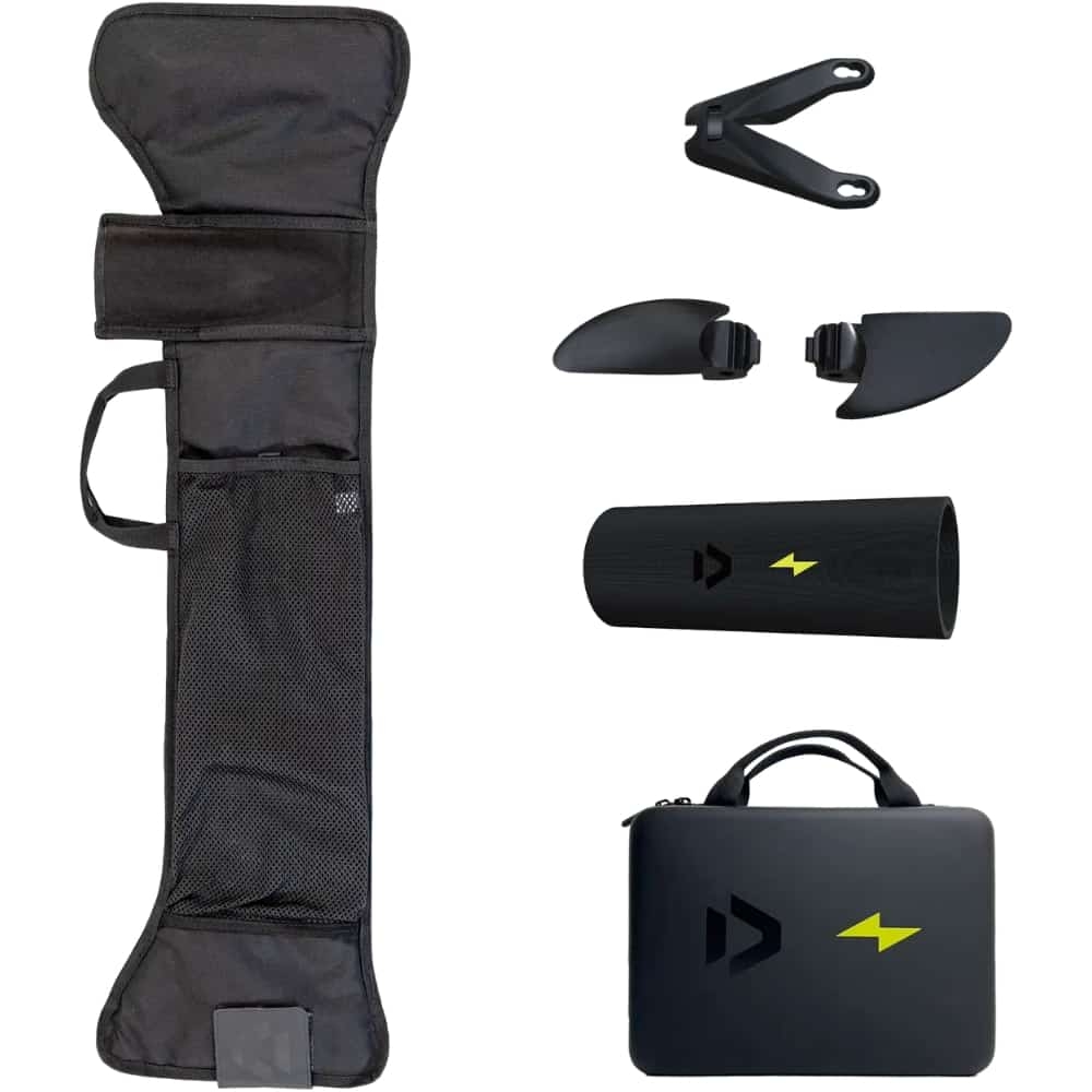 Le Foil Assist est alimenté par deux batteries compactes logées dans un boîtier étanche monté sur un eHarness léger (env. 3,76 kg). Cela permet de garder ta planche libre de poids et de traînée supplémentaires. Avec les batteries placées sur tes hanches, la sensation naturelle et fluide du foil est conservée tout en offrant une liberté totale de mouvement. L’eHarness est flottant et facile à enlever. Un câble longe proprement le leash court de la planche et relie les batteries à l’eMast. Le récepteur intégré dans le boîtier des batteries assure une connexion stable et fiable entre la télécommande et le moteur pendant toute ta session.