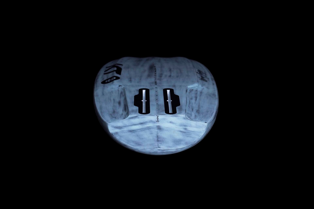 Si KT Surfing fait sensation, en ce moment, avec sa Ginxu et son shape si particulier, nous avions hâte de découvrir cette autre planche shapée par Keith Teboul, moins radicale sur le papier. Dans cette couleur bleue/grise patinée, elle est plutôt aseptisée jusqu’à tomber sur cette tête de squelette façon "Dia de los Muertos", c’est original ! Son shape est très travaillé, avec le fameux quadri-concave, sur l’avant, des rails coupés en deux épaisseurs distinctes pour diminuer la surface mouillée entre la position arrêtée avec le besoin de toute la largeur et ensuite la prise de vitesse et la surface minimale en contact avec l’eau avant de prendre le vol. L’arrière "squash" est lui aussi travaillé avec un arrière coupé, toujours dans l’objectif de diminuer la trainée au moment de prendre de la vitesse. Comme de nombreuses marques, KT a instauré le moins de déchets plastiques dans son mode de livraison et nous avons reçu la planche dans son carton avec juste l’emballage scotch et du carton partout.